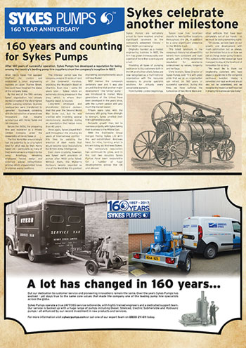 Sykes Pumps celebrate their 150th anniversary. No other company has more expertise and heritage in pumping, de-watering and specialist fluid moving than Sykes. Since Henry Sykes established the business 1857, Sykes Pumps has grown to become the UK’s leading pump hire company. The anniversary was celebrated with a number of events and a special emblem.